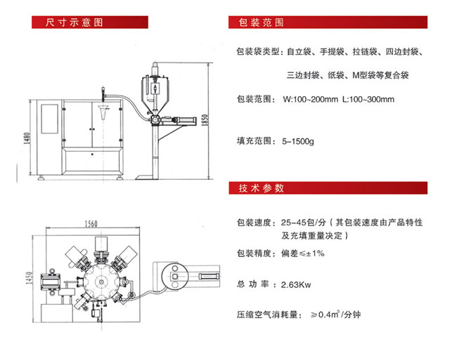 這套設(shè)備主要由預(yù)制袋全自動旋轉(zhuǎn)包裝機與液體,醬體機配套而成。